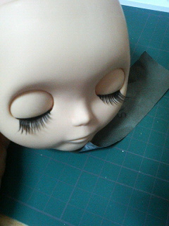 んで、アイホールを削って、それからまつげを引っこ抜き、つけ睫毛を押し込みました。